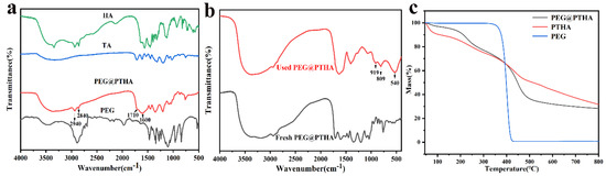 (a) FTIR spectrogram of HA, TA PEG, and PEG@PTHA, (b) FT-IR spectrogram of Fresh PEG@PTHA and used PEG@PTHA, (c) TGA curve of PEG@PTHA, PTHA, and PEG.