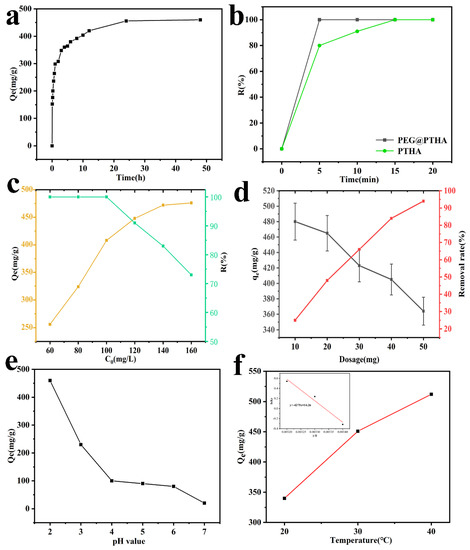 (a) effects of contact time (0–48 h, C0 = 200 mg/L, T = 303 K, dos = 25 mg, V = 100 mL, pH = 2), (b) the difference of removal rate between PTHA and PEG@PTHA (C0 = 60 mg/L, pH = 2, T = 303 K, dos = 25 mg, V = 100 mL), (c) effect of initial concentration (C0 = 60–160 mg/L, T = 303 K, dos = 25 mg, t = 24 h, V = 100 mL), (d) effect of different adsorbent dosage (10–50 mg, C0 = 200 mg/L, T = 303 K, V = 100 mL, pH = 2), (e) effect of PH value (C0 = 200 mg/L, T = 303 K, dos = 25 mg, V = 100 mL, t = 24 h), (f) effect of different environmental temperature (C0 = 200 mg/L, dos = 25 mg, V = 100 mL, t = 24 h).