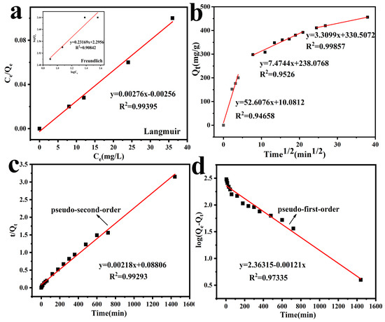 (a) Langmuir isotherm model and Freundlich isotherm model, (b) The intra-particle diffusion model, (c) Pseudo-second-order model, (d) Pseudo-first-order model.