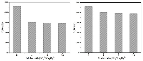 The presence of co-existing ions can affect the adsorption capacity obviously, as can be seen in Figure 6. The addition of NO3− and SO42− decreased the value of Qe, in other words, the adsorption capacity decreased with the interference of both of them. Further increasing the proportion of investment, the value of Qe changed less. Comparing with the weak electrostatic force between the active site and HCrO4−, SO42− had a clear competitive advantage, comparatively, the addition of NO3− did not have an excessive effect due to its weak competition.