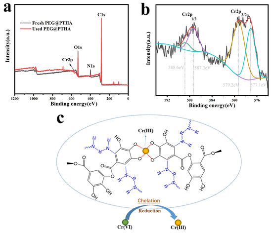 (a) the XPS analysis of fresh PEG@PTHA and used PEG@PTHA, (b) XPS Cr2p spectrogram on the used PEG@PTHA, (c) conjectural mechanism of adsorption.
