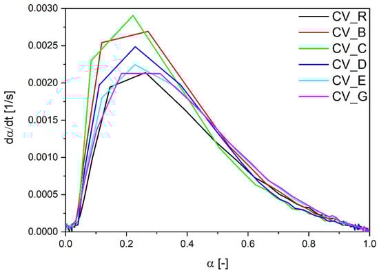 Vulcanization speed as a function of vulcanization degree for rubber compounds prepared in the CV system. CV_...—rubber compounds containing n-ZnO in a conventional curing system; CV_R—reference rubber compound containing standard ZnO in a conventional curing system.