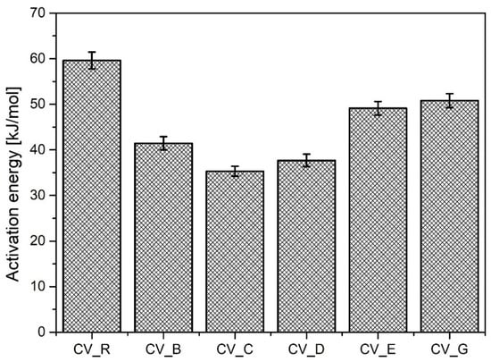 Activation energy for vulcanization of rubber compounds prepared in the CV system. CV_...—rubber compounds containing n-ZnO in a conventional curing system; CV_R—reference rubber compound containing standard ZnO in a conventional curing system.