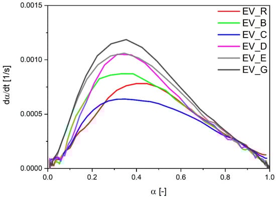Vulcanization speed as a function of the vulcanization degree for rubber compounds prepared in the EV system. EV_...—rubber compounds containing n-ZnO in an effective curing system; EV_R—reference rubber compound containing standard ZnO in effective curing system.