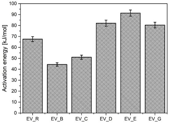 Activation energy for the vulcanization of rubber compounds prepared in the EV system. EV_...—rubber compounds containing n-ZnO in the effective curing system; EV_R—reference rubber compound containing standard ZnO in the effective curing system.