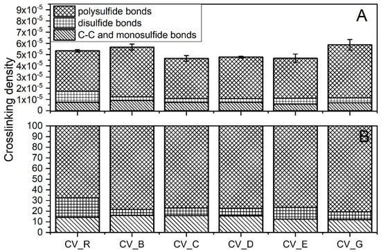 Crosslink structure of the rubber compounds prepared in the CV system: (A) content of crosslinks (mole/cm3); (B) division of crosslinks [%]. CV_...—rubber compounds containing n-ZnO in conventional curing system; CV_R—reference rubber compound containing the reference ZnO in a conventional curing system.