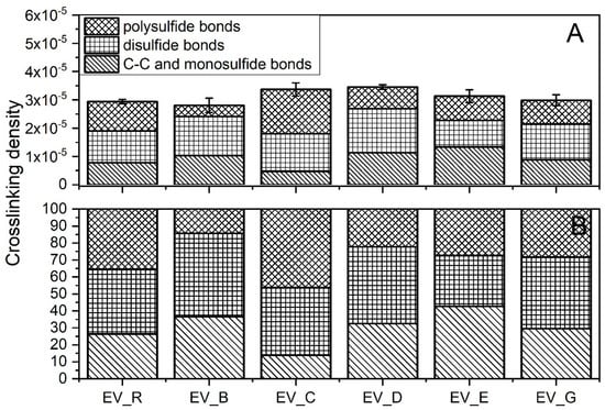 Crosslink structure of rubber compounds produced in the EV system: (A) content of crosslinks (mole/cm3); (B) division of crosslinks (%). EV_...—rubber compounds containing n-ZnO in the effective curing system; EV_R—reference rubber compound containing standard ZnO in the effective curing system.