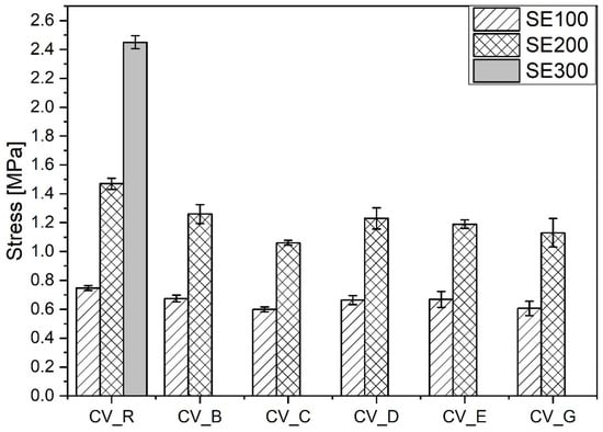 Mechanical properties in the extension of rubber compounds cured in the CV system. CV_...—rubber compounds containing n-ZnO in a conventional curing system; CV_R—reference rubber compound containing standard ZnO in a conventional curing system.