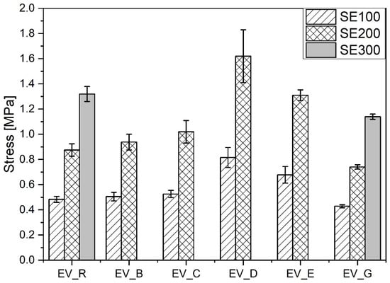 Compared with the reference vulcanizate containing standard ZnO, the vulcanizates containing n-ZnO activators had a lower content of stronger short crosslinks (with the exception of the EV_C sample). This resulted in their having a higher moduli [] (with the exception of EV_G), but did not necessarily result in greater durability in extension, as shown in Figure 9.