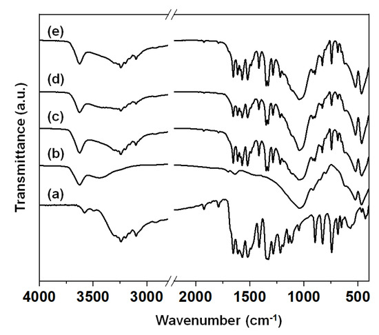 Figure 2 shows the Fourier transform infrared (FT-IR) spectra of intact NIC, NIC(1.0)–MMT, NIC(1.0)–MMT-E, and NIC(1.3)–MMT-E hybrids. The intact NIC showed major characteristic peaks at 3577 cm−1, 3490 cm−1, 1650 cm−1, 1517 cm−1, and 570 cm−1, those which could be assigned as -OH, -NH, -C=O, -NO2, and C–Cl groups, respectively (Figure 2a) [59,60]. The pristine MMT showed a characteristic broad band near 3400 cm−1 due to the –OH stretching vibrations of interlayered water molecules (Figure 2b). The band at 3630 cm−1 was corresponding to the –OH groups originating from the Al–OH, and that at 1041 cm−1 was from the Si–O bonds bound to the aluminum octahedrons in MMT [61]. The characteristic band at 915 cm−1 was due to Al–Al–OH stretching, and the band at 530 cm−1 was due to the Al–O–Si stretching [29,35]. After the hybridization (Figure 2c–e), all characteristics peaks of NIC and pristine MMT were overlapped within those of NIC-loaded MMT hybrids.