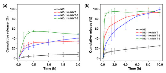 In vitro release profiles of NIC from intact NIC, NIC(1.0)–MMT, NIC(1.0)–MMT-E, and NIC(1.3)–MMT-E hybrids in (a) pH 1.2 medium, and (b) pH 6.8 medium that contained 2% Tween 60.