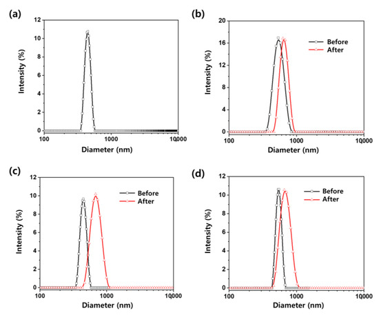 The particle size distribution of (a) pristine MMT, (b) NIC(1.0)–MMT, (c) NIC(1.0)–MMT-E, and (d) NIC(1.3)–MMT-E hybrids before Tween 60 coating (black line) and after Tween 60 coating (red line).