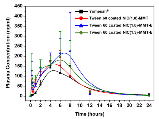 In order to evaluate the effect of Tween 60 coating for NIC–MMT hybrids on the blood retention of NIC, Tween 60-coated NIC(1.0)–MMT, Tween 60-coated NIC(1.0)–MMT-E, and Tween 60-coated NIC(1.3)–MMT-E were orally treated to rats, and the mean plasma concentration of NIC was compared with Yomesan®, as a control. The mean plasma concentration–time profiles and the relevant pharmacokinetic parameters of orally administered Yomesan® and Tween 60-coated NIC–MMT hybrids in rats are shown in Figure 5 and Table 1, respectively. Appreciably, higher NIC levels were measured in the rat plasma administered with Tween 60 coated NIC–MMT hybrids as compared with Yomesan®. According to the literature [65,66,67], the polymer surfactants such as Tween 20, Tween 60, Tween 80, Brij 35, Brij 72, etc. in formulation could result in an improvement in drug solubility and oral bioavailability. In particular, the highest NIC levels were found in the rat plasma administered with Tween 60-coated NIC(1.0)–MMT-E (Figure 5). As shown in Table 1, the parameters, Cmax, AUC(last), and AUC0-∞ for NIC were 2.0-fold, 1.6-fold, and 1.5-fold higher for Tween 60-coated NIC(1.0)–MMT-E than for Yomesan®, respectively, with a considerable increase in Tmax. The increased systemic exposure of NIC became evident after oral administration of Tween 60-coated NIC(1.0)–MMT-E, suggesting that the sustained release of NIC out of MMT layers was efficiently made for enhancing the plasma NIC concentration and its circulation time. These results could also be explained by the mucoadhesive property of the present drug carrier, MMT [35,46,68,69], in which the hydroxyl groups of MMT lattice could form strong hydrogen bonding with the mucous layer in the rat intestine. Moreover, the controlled dissolution profile of NIC molecules from NIC(1.0)–MMT-E under the intestinal condition during 10 h suggested that the low solubility of NIC could be remarkably increased by the deintercalation of NIC from NIC(1.0)–MMT-E layers (Figure 3). Consequently, the controlled release property and the increased solubility of NIC from NIC(1.0)–MMT-E in gastric and intestinal fluids, respectively, could contribute to the enhanced oral bioavailability of poorly soluble drugs.
