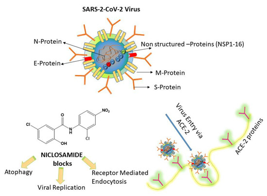 - Pindiprolu, S.K.S.S.; Pindiprolu, S.H. Plausible mechanisms of Niclosamide as an antiviral agent against COVID-19. Med. Hypotheses 2020, 140. [Google Scholar] [CrossRef]