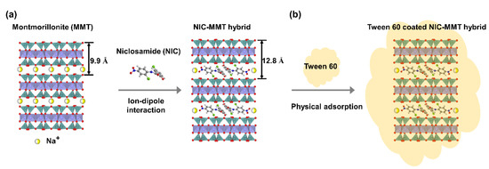 Schematic illustration of (a) NIC molecules intercalated into 2D montmorillonite (MMT) lattice via ion–dipole interaction and (b) NIC–MMT coated with Tween 60 through physical adsorption reaction.