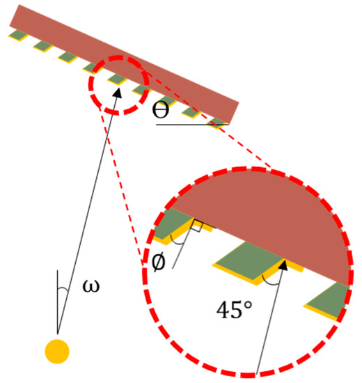 The absorber was deposited on the slanted backbone by thermal deposition. The geometry of the thermal deposition components determines the deposited thickness. Gold pellet (iTASCO, Seoul, Korea) 6 g was heated in a tungsten boat (iTASCO, Seoul, Korea). The set sample loading angle, θ, of the wafer was as shown below: