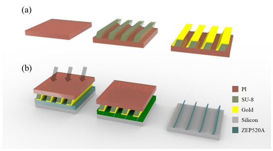 In addition, to fabricate groove structures, polydimethylsiloxane (PDMS) soft lithography was conducted instead of direct patterning on a negative resist. The PDMS base and the curing agent (Dow Corning, Midland County, MI, USA) were mixed at 10:1 (w/w) and cured overnight in an oven at 60 °C (OV-11; Jeio Tech, Daejeon, Korea). It was confirmed that the slanted PDMS groove had the same depth and period as the mold based on SEM, as shown in Figure 6. However, the width and angle differed slightly from the patterned mold, which was inferred to be due to the high aspect ratio of the oblique structure and the resolution of the PDMS.