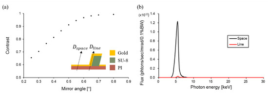 where and are the maximum and minimum intensity, respectively, which can be replaced by the dose on space, and dose on line, , respectively; dose on space is the transmittance of the gold deposited at a thickness of 0.5 µm on the bottom of the mask, and dose on line is the transmittance of 4-μm-thick gold. The contrast is related to the mask design and the spectral range of the source energy, which can be modulated using optics. In this study, the bending magnet of the 9D X-ray nano/micromachining (XNMM) beamline in the Pohang Accelerator Laboratory was used as an X-ray source. The energy spectral range of the beamline can be modulated by adjusting the angle of a pair of total-reflection X-ray mirrors. Contrast is improved at higher mirror angles by the cutoff in intensity in the high-energy region that is not readily absorbed. The calculated contrast depending on the mirror angle is shown in Figure 4a. When the mirror was set to 0.6°, the contrast was 0.968 with 20 min of exposure time, and detailed spectra are shown in Figure 4b.