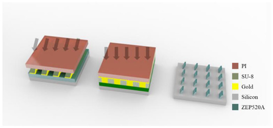 where ω is the traveling angle of gold related to normal direction to ground, and ∅ is the target angle of the backbone. In this experiment, the angle between the backbone wall and the deposition direction was set to 45° for the entire process of deposition on the sidewall. The angle between the gold source and the sample was 11°, and the loading angles of the 70° and 80° samples were 36° and 46°, respectively. The deposition scheme is depicted in Figure 2. The mask fabrication process and the usage of the mask are summarized in Figure 3.