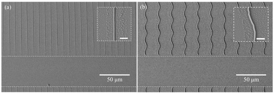 The dotted-dashed line length and spacing can be controlled by changing the fill factor of the micron-scale mask. In addition, oblique fusion structures of various shapes with different lengths or periods can be realized using this technique. As examples, short periodic line patterns were fabricated using a micron-scale mask for a 1:1 line and spacing pattern (Figure 8). The oblique nano-scale mask can also be designed to produce wavy lines. Using the same process, wavy lines in addition to straight lines were also created successfully (Figure 9).