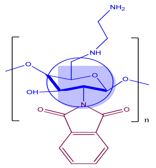 The chemical compositions of chitosan components powerfully influence its biological activity. These factors certainly must be taken into account in an analysis of its antiviral activity [9]. Chitin has a chemical structure of a characteristic supplementary biopolymer found in the exoskeletons of roaches and crustaceans [10], but chitosan is frequently obtained by the deacetylation of chitin [11]. CS has a few receptive NH2groups that offer additional chemical alteration for the expansion of derivatives that are cost-effective [12]. Deacetylated chitosan is an extremely useful and readily available bioactive polymer [13,14]. Chitosan displays several beneficial biological properties, such as antitumor and antimicrobial [15]. The antiviral activity of chitosan is determined by its structure and, by the polymerization degree of the molecule [16]. Thus, the high polymeric preparations of polysaccharides possess antiviral activity. On the other hand, it has been shown that the high polymeric chitosan’s significantly increased its antiviral activity [17,18]. It consists of unbranched chain of β-glucose as repeating units [19]. As a result, data on the dependence of chitosan derivative, mainly the polymerization degree, are in significant disagreement, which can be determined by the variety of chitosan sources [20]. Chitosan is depolymerized by chemical hydrolysis, which is performed for obtainingsamples of the polysaccharide. The initial high molecular (HM) samples of chitosan and the methods of its purification also can increase the biological activity of its chitosan derivatives [21]. The polymeric structure of chitosan derivative is given in Figure 2 [22].