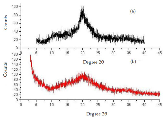 X-ray Diffraction Study of pure chitosan (a) and chitosan derivative (b).