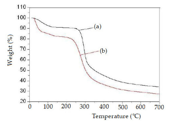 Thermogravimetric analysisof pure chitosan (a) and chitosan derivative (b).