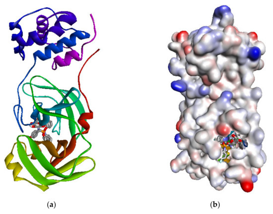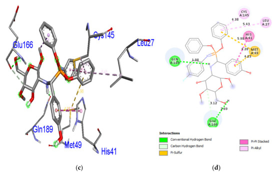Molecular docking tests are regularly used to analyze binding interactions. The relationships of between the target protein (PDB ID: 6LU7) and the synthesized chitosan derivatives 1a–1j were determined with AutodockVina 1.1 [35]. The crystal structure SARS coronavirus core protease (PDB ID: 6LU7) was obtained from the Protein Data Bank (http:/www.rcsb.org (accessed on 5 September 2020)). ChemDraw Ultra 12.0 and Chem3D Pro 12.0 programming suites were utilized to sketch the 3D structures of the ligand molecules and energyminimization. AutoDock Tools 1.5.6 was utilized to fabricate the AutodockVina input contents. In manufacturing the co-crystallized inhibitor molecule using the discovery studio program, α-ketoamide was used to identify the binding pocket. The amino acid residues Thr24, Thr26, Phe140, Asn142, Gly143, Cys145, His163, His164, Glu166, and His172were present in the binding pocket. The SARS COVID-19 main protease quest grid was recognized as center x: −10.656, center y: 17.223, center z: 67.024 in dimension x: 20, y: 20, and z: 20 in 1.0 Å spacing. The significance of completeness was set to 8. The extra limitations were fixed and not indicated by default for Autodock Vina. Thecompound that consumed the smallest binding affinity value is achieved the highest score, the implications of which were visually examined with Discovery studio 2019.