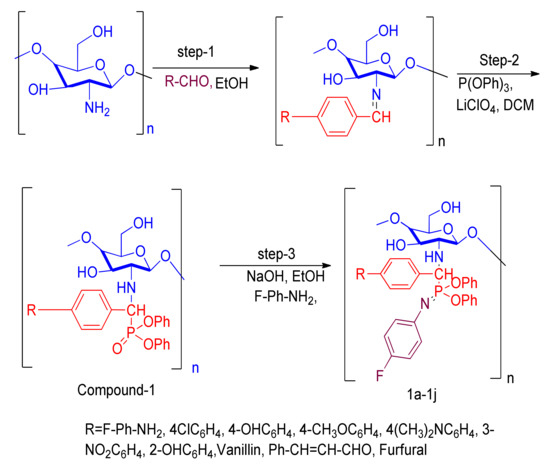The chitosan derivatives of compound 1 were prepared following a method found in the literature [36]. Synthesis of amino phosphate chitosan involved Schiff base formation and fluoro aniline was added to β-chitosan (Mwt.577) (1a–1j) by the procedure described in [37]. The amino group present in β-chitosan (C2-Position) are significant because they are nucleophilic and eagerly react with electrophilic reagents. Because of this, biologically active moieties were grafted into the amino group of chitosan. Compound 1 reacted with 4-fluoroaniline, NaOH, and ethanol added at high temperature and underwent a dehydration reaction to obtain Compound 1a as a white solid. The reaction was monitored by thin layer chromatography (TLC). After completion of the reaction, the crude product was recrystallized by ethanol. The above procedure was followed for other (1b–1j) synthesized chitosan derivatives. The synthesized compounds were confirmed by analytical technique, such as FT-IR, 1H NMR and 13C NMR as seen in Supplementary Materials (Figures S1–S3). The FT-IR spectra exhibited absorption bands (1a–1j) at 895, 1170, 1383, 3045, 3250, and 3450cm−1, confirming P-O-C, P=N, N-C, Ar-H, NH, and OH functional groups. The 1H NMR spectra (1a–1j) showed chemical shift values at δ 10.60, 9.34–7.95, 8.50–6.64, 7.28–6.96, 6.87–6.60, 5.55, and 3.85 ppm, confirmingOH, NH, P-O-Ph, F-NH2, CH, and OCH3 protons, respectively. The 13C NMR showed (1b–1j) signals at157.7–115.3, 152.7–121.3, 75.3, and 56.2 ppm, confirming the F-NH2, P-O-Ph, CH, and OCH3 of carbon atoms. Chitosan derivatives were affirmed by mass spectroscopy and elemental analysis. The synthesis of chitosan derivatives are shown in Scheme 1.