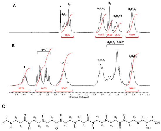 The triplets of protons c2 and d2 localized in outer shell (shell 2 in case of G2) were observed at 3.23 and 2.71 ppm, respectively, with [32H] integral intensity both. Inner sphere c and d resonances showed overlapping triplet from c1,c0 at 3.29 ppm (intensity [24H]) and d1,d0 (overlapped with core singlet of intensity [4H], totally [28H]) for G2 (Figure 1A). Upon addition of gl into terminal amine groups, the outer sphere c2 resonance shifted into 3.3. ppm-centered multiplet and overlapped with c1c0 triplets within the 3.32–3.38 region. The total intensity of c2c1c0 resonances corresponds to [56H]. The resonance from d2 is spread over a broad 2.75–2.57 region and overlapped with d1, d0, and o from G2 core and terminal nitrogen-attached methylene group of glycidol. Additionally, resonances from the latter show multiplet structure due to the presence of diastereotopic -CH2- next to the chiral center at carbon f.