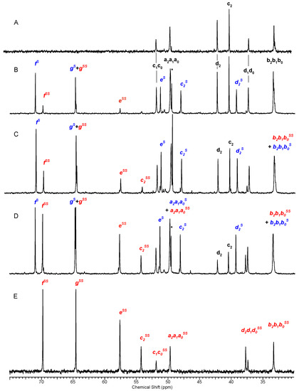 These two species were then used to convert remaining free amine groups and mono-substituted ones into bis-substituted ones. Thus, we obtained the average substituted G29Sgl23Rgl and G222Sgl10Rgl. The corresponding 1H NMR spectra enabled us to identify these species as fully substituted, although they did not illustrate the symmetry of mixed-isomer derivatives. Therefore, we examined the 13C NMR, which are presented for starting G29Sgl and G222Sgl (Figure 1A,E) and mixed G29Sgl23Rgl and G222Sgl10Rgl (traces B and D, respectively). There are essentially two sets of gl resonances observed in the 13C NMR spectra of the products, which were assigned to the chiral arm and meso arm. Two sets of carbon f resonances can be identified at ca 70 ppm (downfield shifted fSS and fRR for chiral arm and upfield shifted fSR for meso arm (Figure S3, traces B and D). However, even in the spectra of compounds G29Sgl23Rgl and G222Sgl10Rgl, which were obtained under kinetic control, there are some other species of highly distorted symmetry, which show low-intensity f carbon resonances shifted downfield and g carbon resonance shifted upfield. These signals are much pronounced in the spectrum of G232Racgl (trace C), which is obtained by one portion addition of rac-gl into G2 dendrimer. These puzzling symmetry arms might origin from elongated polyhydroxy substituents because on the one hand the intensity of gl 1H NMR resonances clearly indicates that the number of attached gl residues is 32; on the other hand, in the 13C NMR spectrum, the resonance from the single-substituted arm is still present at ca 51 ppm (Figure S3, trace C). It should be emphasized that this spectral pattern is reproducible for reported G116Racgl [20] and for fully substituted G364Racgl, G4128Racgl, and G5256Racgl (not shown here).