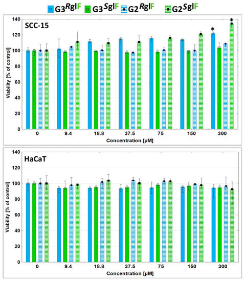 Cytotoxicity of G3RglF, G3SglF, G2RglF, and G2SglF after 24 h treatment of human squamous carcinoma cells (SCC-15) and human immortalized keratinocytes (HaCaT). Cell viability is presented as medians of a percent against non-treated control (control expressed as 100%). The whiskers are lower (25%) and upper (75%) quartile ranges. * p ≤ 0.05; Kruskal–Wallis test (against non-treated control).