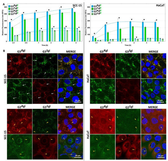(A): Time-dependent accumulation of G3RglF, G3SglF, G2RglF, and G2SglF in immortalized human keratinocytes (HaCaTs) and squamous carcinoma cells (SCC-15). Cells were incubated with 1 µM working solutions of dendrimers for 0.1–4 h and the fluorescence signal was measured with a fluorescence microplate reader at 485 nm/530 nm (exc./em.). Results are expressed as medians of relative fluorescence units, and the whiskers are lower (25%) and upper (75%) quartile ranges. ▼ p ≤ 0.05; Mann–Whitney U-test (S against R enantiomers). (B): Confocal microscopy images of HaCaT and SCC-15 cells incubated for 4 h with 100 nM solutions of dendrimers in the respective pairs (G3RglR–G3SglF), (G3RglF–G3SglR), (G2RglR–G2SglF), (G2RglF–G2SglR). White arrows indicate dendrimers bounded with cell membranes. Yellow arrows show the presence of dendrimers in nucleoli.