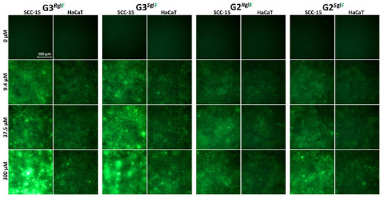Figure 6B shows that G3gl dendrimers indicated a high affinity for cell membranes, especially SCC-15 tumor cells, as indicated by white arrows. A similar effect was observed by Albertazzi et al. in HeLa cells after incubation with fluorescently labeled G4 PAMAM dendrimer [41]. The observed phenomenon was weaker in HaCaT cells, and these differences may be connected with variations in transfer efficiency of studied nanoparticles into cells. To visualize concentration-dependent differences in the accumulation of dendrimers in both cell lines, we also performed additional visualization in a fluorescence microscope (Figure 7). Cells were incubated with conjugates G3RglF, G3SglF, G2RglF, and G2SglF in the range of 0 –300 µM concentrations for 24 h. Images illustrate that the number of dendrimers in the cells increased with their concentration and regardless of the concentration all compounds were more efficiently taken up and accumulated in SCC-15 tumor cells than in keratinocytes (Figure 7).