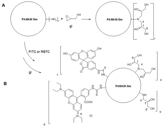 The scheme of synthesis of glycidol-modified polyamidoamine (PAMAM) G3 (m = 3) and G2 (m = 2) dendrimers (A) and fluorescein or rhodamine B dendrimers substituted by addition of glycidol (B). The isothiocyanates of fluorescein (FITC) and rhodamine B (RBTC) were used to attach one molecule of label by thiourea bond into a dendrimer molecule. The following series of not-labeled and fluorescein-labeled (F) and rhodamine B-labeled (R) derivatives were obtained by stepwise addition of glycidol: G29Sgl; G214Sgl; G222Sgl; G232Sgl; G216RglF (2a + b = 16, c = 1, d = 0); G219SglF (2a + b = 19, c = 1, d = 0); G319RglF (2a + b = 24, c = 1, d = 0); G335SglF (2a + b = 35, c = 1, d = 0); G219RglR (2a + b = 19, c = 0, d = 1); G230SglR (2a + b = 30, c = 0, d = 1); G345RglR (2a + b = 45, c = 0, d = 1); G335SglR (2a + b = 45, c = 0, d = 1).