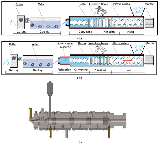 Schematic of the screw extruder (a) without and (b) with the molten resin reservoir, and (c) cross-sectional schematic of the molten resin reservoir.