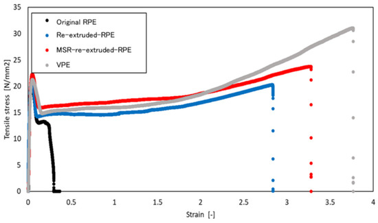 - The results of the tensile tests indicated that the re-extrusion treatment had a significant effect on the tensile performance of the RPE moldings. In particular, the MSR-re-extruded RPE molding exhibited the highest elongation at break, breaking energy, and Young’s modulus of the RPE moldings, which were comparable to those of the VPE pellet molding.