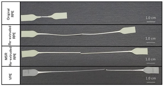 Figure 3 shows representative tensile stress–strain curves of the pellet moldings prepared using non-extruded RPE (original RPE), re-extruded RPE prepared using the extruder without the MSR (re-extruded RPE), re-extruded RPE prepared using the extruder with the MSR (MSR-extruded RPE), and VPE. Figure 4 and Figure 5 show the average values of the elongation at break, breaking energy, and Young’s modulus of each molding and representative digital photographs of the elongated tensile specimens of each sample.