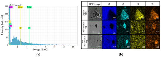 Figure 6 shows the SEM-EDS maps of the RPE pellet moldings. Three contaminating elements were observed in the EDS spectra of all RPE pellet moldings: O, Cl, and Ti. These contaminants could originate from additives, including pigments such as TiO2. Furthermore, comparing the SEM-EDS maps of the original and both re-extruded RPE pellet moldings, the sizes of the contaminant particles are different. Specifically, the re-extrusion treatment reduced the size of the contaminant particles compared with those in the original sample.