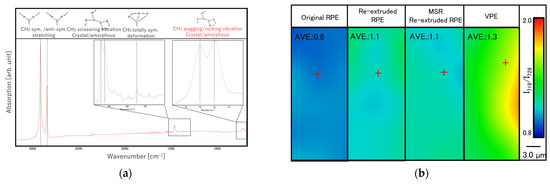 Figure 8a shows a typical FT-IR spectrum of the RPE molding. In addition, the FT-IR imaging results based on I718/I728 (vide infra) and the average I718/I728 values calculated from these images are shown in Figure 8b. In the FT-IR spectrum of the RPE moldings, typical peaks corresponding to PE were observed, including the strong CH2 asymmetric stretch (2920 cm−1), strong CH2 symmetric stretch (2850 cm−1), strong bending deformation (1473 and 1463 cm−1), and medium rocking deformation (728 and 718 cm−1) [17]. The intensity ratio of the bands at 718 and 728 cm−1 (I718/I728) can be used to assess the degree of amorphousness in the trans-conformation PE chain and was used to analyze the secondary structure of the RPE moldings. As shown in Figure 8, the I718/I728 ratio was uniform, indicating that the degree of amorphousness of the moldings was also uniform. Moreover, the average values of I718/I728 for the re-extruded RPE and MSR-re-extruded RPE pellet moldings slightly changed from those of the original moldings (0.8→1.1). However, there were no differences between the values of the re-extruded RPE and MSR-re-extruded RPE pellet moldings. Therefore, the MSR did not affect the amorphousness of the moldings significantly.