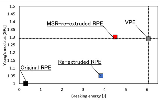Relationship between the Young’s moduli and breaking energies of the original recycled polyethylene (RPE, black), re-extruded RPE (blue), molten resin reservoir (MSR)-re-extruded RPE (red), and virgin PE (VPE, grey).