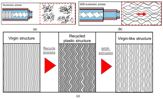 - For the extruder with an MSR, the laminar flow of the molten polymer in the MSR aligned the molten polymer chains in the direction of the flow. This resulted in the formation of a stripe-like lamellar structure in the moldings. Finally, the MSR-re-extrusion treatment altered the distorted lamellar structure of the recycled RPE pellet molding to a virgin-like structure. Consequently, this resulted in the MSR-re-extruded RPE moldings having virgin-like mechanical properties. In our future work, the MSR system will be improved to control the temperature, pressure, and shape of the cavity, and the relationship between the MSR parameters and the mechanical properties of the recycled plastic moldings will be revealed
