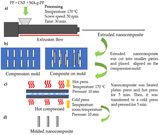 Nanocomposites were compounded by using a twin-screw extruder (Imoto machinery Co., Ltd. Model IMO-160B, Kyoto, Japan). Figure 1 shows the processing flow of nanocomposites. The ratio of CNF to PP used in this study was 1 to 5 wt.%, and MA-g-PP, which acts as a compatibilizer, was added at 3 wt.% based on the weight of PP. Both PP and MA-g-PP were firstly melted at 170 °C, followed by the addition of CNF suspension. A rotating speed of 50 rpm was used throughout the extrusion (Figure 1a). The PP/CNF nanocomposite produced was extruded out through die as strands and cooled prior to compression molding.
