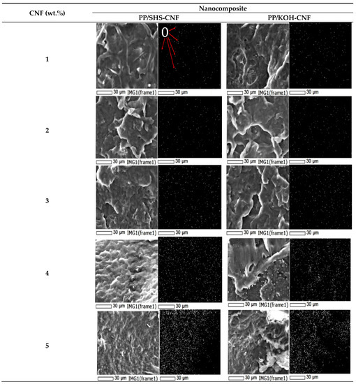 In order to determine the effect of hemicellulose residue on the dispersion and distribution of CNF within the PP matrix, SEM-EDS analysis was conducted. Figure 2 shows the SEM-EDS images of the fractured samples of PP/SHS-CNF and PP/KOH-CNF nanocomposites, respectively. The EDS analysis was conducted to detect the distribution of oxygen element as a representative of CNF distribution, and it was represented by white spots in the EDS images [10]. From the SEM-EDS images, the PP/SHS-CNF nanocomposite exhibits better CNF dispersion and distribution up to 4 wt.% CNF, compared to the PP/KOH-CNF nanocomposite which only showed good dispersion and distribution up to 3 wt.% CNF. This observation could be explained by the presence of hemicellulose in SHS-CNF which prevented the CNF being agglomerated.