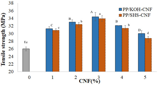 The increment in mechanical properties was observed when CNF was incorporated in the PP matrix as shown in Figure 3 and Table 1. The results revealed that the tensile strength improved by 31–32% after 3 wt.% CNF was incorporated in the PP matrix for both SHS-CNF and KOH-CNF. This could be attributed to the homogenous distribution of CNF in the polymer matrix and the chemical composition of pretreated CNF [33]. Theoretically, the mechanical properties of a nanocomposite may increase by increasing the fiber loading in the polymer matrix [38,39,40]. Nevertheless, the mechanical performance of the nanocomposite was reduced after the incorporation of 4 and 5 wt.% CNF. This could be related to the dispersion of CNF in PP, as discussed before. The aggregated CNF in the nanocomposite was clearly seen at a high amount of CNF loaded in the matrix. From Figure 2, aggregation can be observed after 4 wt.% CNF was incorporated in the PP matrix. According to Yin et al. (2018) [41] and Feng et al. (2017) [42], the aggregation of CNF can act as stress-concentration sites, which causes poor stress transfer in the matrix and eventually reduces the mechanical performance of the nanocomposite [43,44].