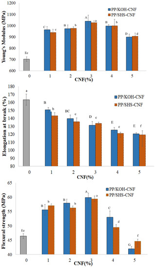 Mechanical performance of PP/CNF nanocomposite prepared from CNF suspension (1 to 5 wt.%). All data are means of 5 replicates ± S.D. Capital letters indicate significant difference (p < 0.05) among the PP/KOH-CNF nanocomposites, while small letters indicate significant difference (p < 0.05) among the PP/SHS-CNF nanocomposites according to one-way ANOVA and Duncan’s multiple range test.
