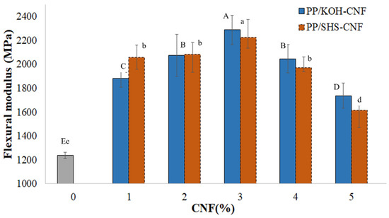 Both SHS-CNF and KOH-CNF exhibited almost similar mechanical performance. The statistical analysis shown in Figure 3 revealed that there was no significant difference in the mechanical performance of PP/SHS-CNF and PP/KOH-CNF nanocomposites. For example, the tensile strength of PP/SHS-CNF (3 wt.%) and PP/KOH-CNF (3 wt.%) nanocomposites was 33.93 ± 0.8 MPa and 34.42 ± 1.1 MPa, respectively. Similarly, the flexural strength between these nanocomposites was found not significant as the PP/SHS-CNF (3 wt.%) nanocomposite had a flexural strength of 59.46 ± 1.0 MPa; meanwhile, the PP/KOH-CNF (3 wt.%) nanocomposite recorded an almost similar value at 59.88 ± 1.6 MPa. This indicates that the presence of 11 wt.% hemicellulose in SHS-CNF did not significantly influence the mechanical performance of the nanocomposite.