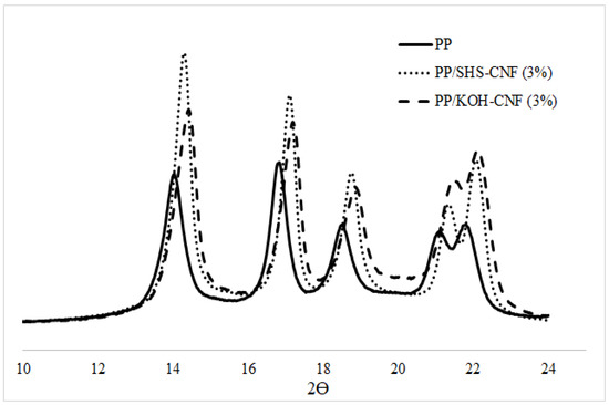 The XRD diffractograms of neat PP and PP/CNF nanocomposites are shown in Figure 4 and Table 2. PP was characterized by four main peaks at about 14°, 17°, 18°, and 22°. It can be seen that the addition of CNF causes a significant shift in Bragg’s angle. This shift and variation in interplanar distances might be attributed to the crystallite size variations of CNF. The incorporation of CNF into the PP matrix results in different long-range compressive forces on the crystals and unit cells, hence this explains the shifted diffraction peaks of PP/CNF nanocomposites [46,47]. All PP/CNF nanocomposites showed a higher crystallinity index (CrI) value than neat PP, which explains the better mechanical performance of the nanocomposite compared to neat PP. According to Shalwan and Yousif (2014) [48], Essabir et al. (2016) [49] and Sharip et al. (2021) [50], the CrI of the nanocomposite changed by self-nucleation effect (homogenous nucleation) and/or by a nucleating agent (heterogeneous nucleation). Hence, in this case, it is considered that CNF acted as a nucleating agent and produced seed crystals, resulting in the promotion of secondary crystallization and finally increasing the CrI value of the nanocomposite [51]. By comparing the CrI value of both nanocomposites, the crystallinity index of the PP/SHS-CNF nanocomposite was slightly lower than the PP/KOH-CNF nanocomposite. This could be explained by the presence of hemicellulose, which influenced the crystallinity by increasing the amorphous region of the CNF.