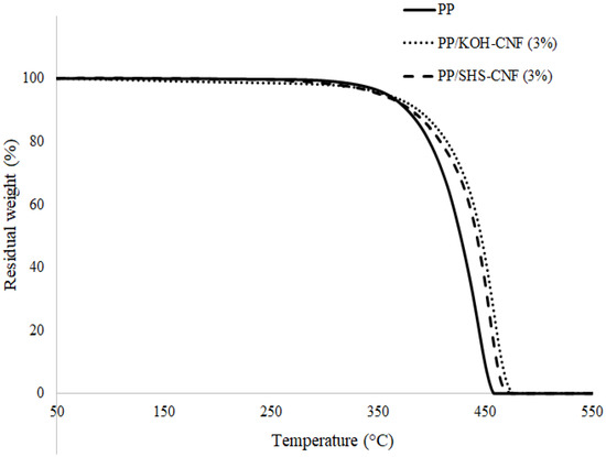 Thermal stability was evaluated based on the decomposition temperature at 5% weight loss (Td5%), 10% weight loss (Td10%) and 50% weight loss (Td50%) of the samples. Data for the thermogravimetry (TG) thermogram are shown in Figure 5 and Table 3. All thermograms exhibited no weight loss at temperatures lower than 200 °C, indicating that CNF is thermally stable up to 200 °C. The Td5% and Td10% values were recorded for each composite sample as they represent the initial degradation temperature derived from the reinforcing material in a polymer matrix [26]. The PP/SHS-CNF nanocomposite was slightly unstable at the beginning, where the Td5% value was lower as compared to the PP and PP/CNF-KOH nanocomposite. This could be explained by the presence of hemicellulose in the SHS-CNF sample. Hemicellulose is known to be amorphous and less thermally stable than cellulose. It has a lower degradation temperature as compared to cellulose and PP.