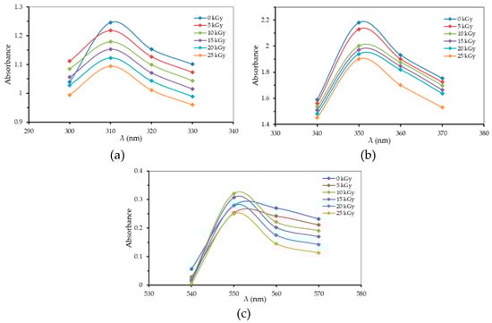 The relationship between absorbance (A) and wavelength (λ) for phosphoric acid (H3PO4) 75 v% concentration for each radiation dose: (a) λ = 310 nm (peak I); (b) λ = 350 nm (peak II); (c) λ = 550 nm (peak III).